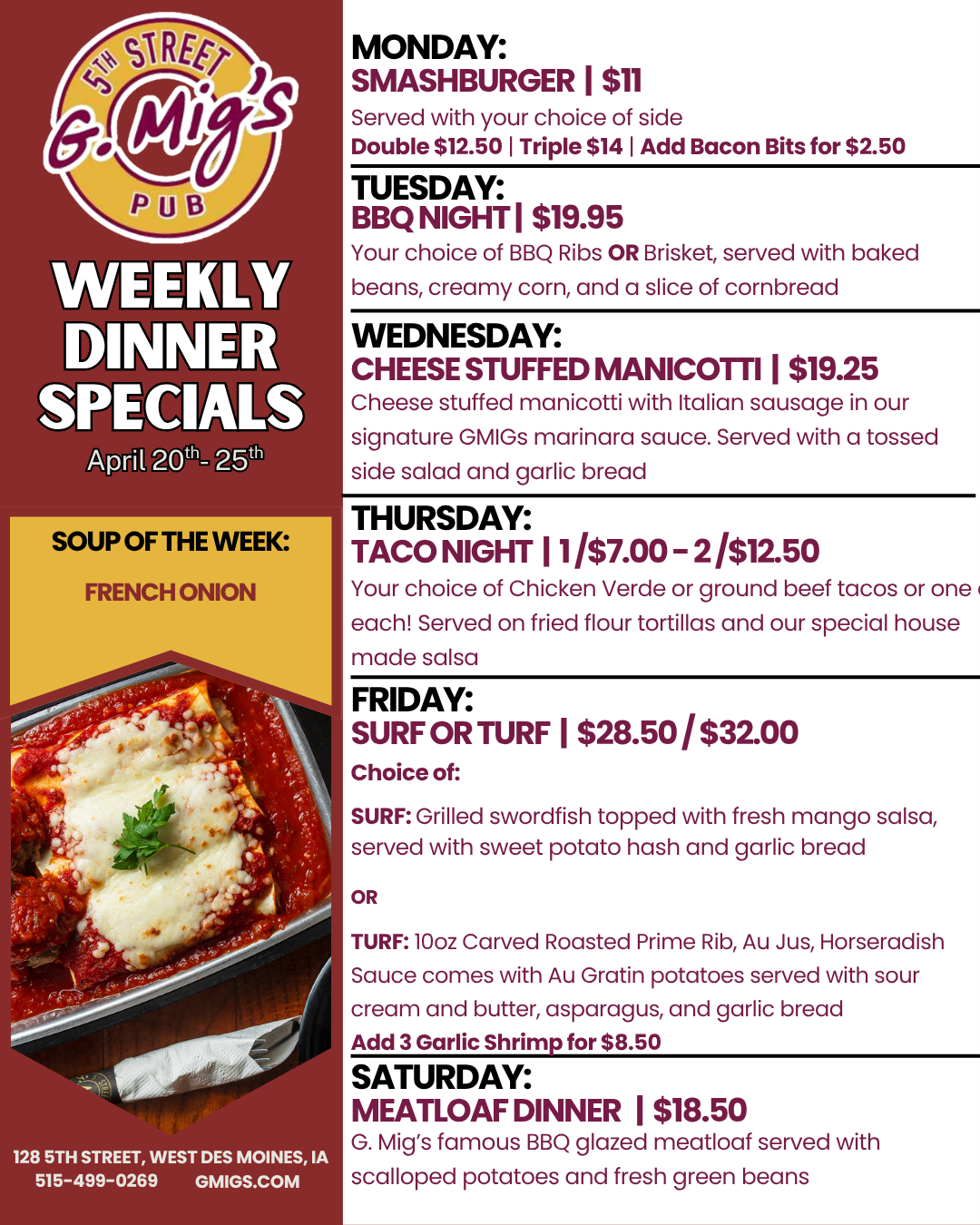 My favorite lunch spot in Des Moines. I would highly recommend the prime rib burger, one of the best I have ever had. It is my go to during most visits. The flat bread pizza is my second choice.